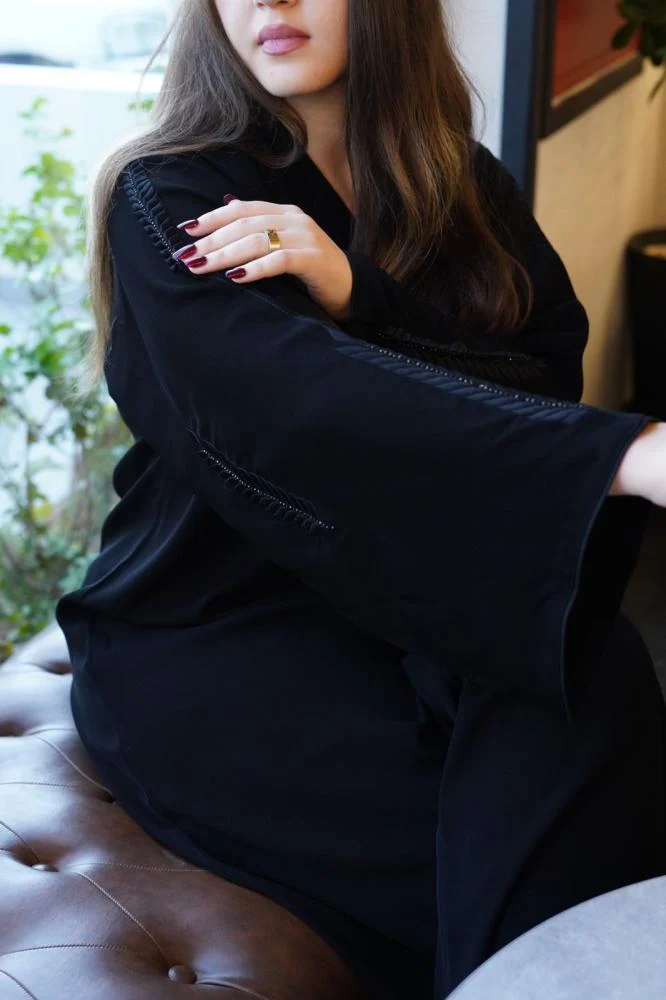 - تتميز العباية بتصميم عصري مع لمسات من التطريز الأسود على الأكمام لإضفاء لمسة فنية.
