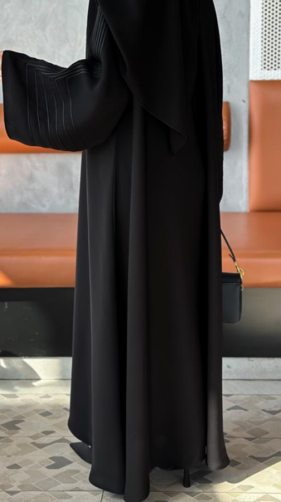 - تفاصيل العباية فاخرة زخارف خطوط راقية على الأكتاف تعزز من جمالية العباية.