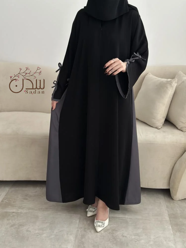 عبايه دبل فيس من سدن أنيقة باللون الأسود الكلاسيكي، تتميز عباية سدن بلمسات رمادية ساحرة على الجوانب والأكمام، تضيف لمسة من التباين العصري والجذاب، تزين الأكمام والجوانب فيونكات رمادية أنيقة تعكس الذوق الراقي والبساطة الفاخرة لتكون خيارًا مثاليًا للمرأة التي تبحث عن الأناقة والتميز.