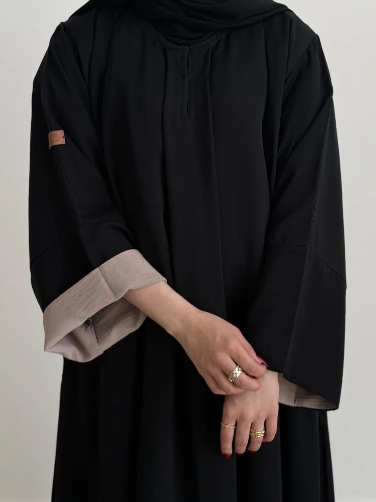 عباية بيج بإطلالة ملكية فاخرة من متجر سدن ، لتتألقي بجمال التفاصيل وفخامة التصميم مع عباية كم بيج المصنوعة من قماش الكريب الملكي باللون الأسود الأنيق ولمسة ناعمة من البيج في الأكمام بتصميم دابل فيس ، حيث تأتي عباية سدن بتصميم أنثوي راقٍ يأتي بقصة نص كلوش مريحة وواسعة تناسب ذوق المرأة العصرية ، القفلة الأمامية مصممة بأزرار طقطق عملية تضيف لمسة عملية وجمالية في آن واحد ، لتمنحكِ سهولة في الارتداء وأناقة في الظهور، سواء في الإطلالات اليومية أو المناسبات الخاصة.